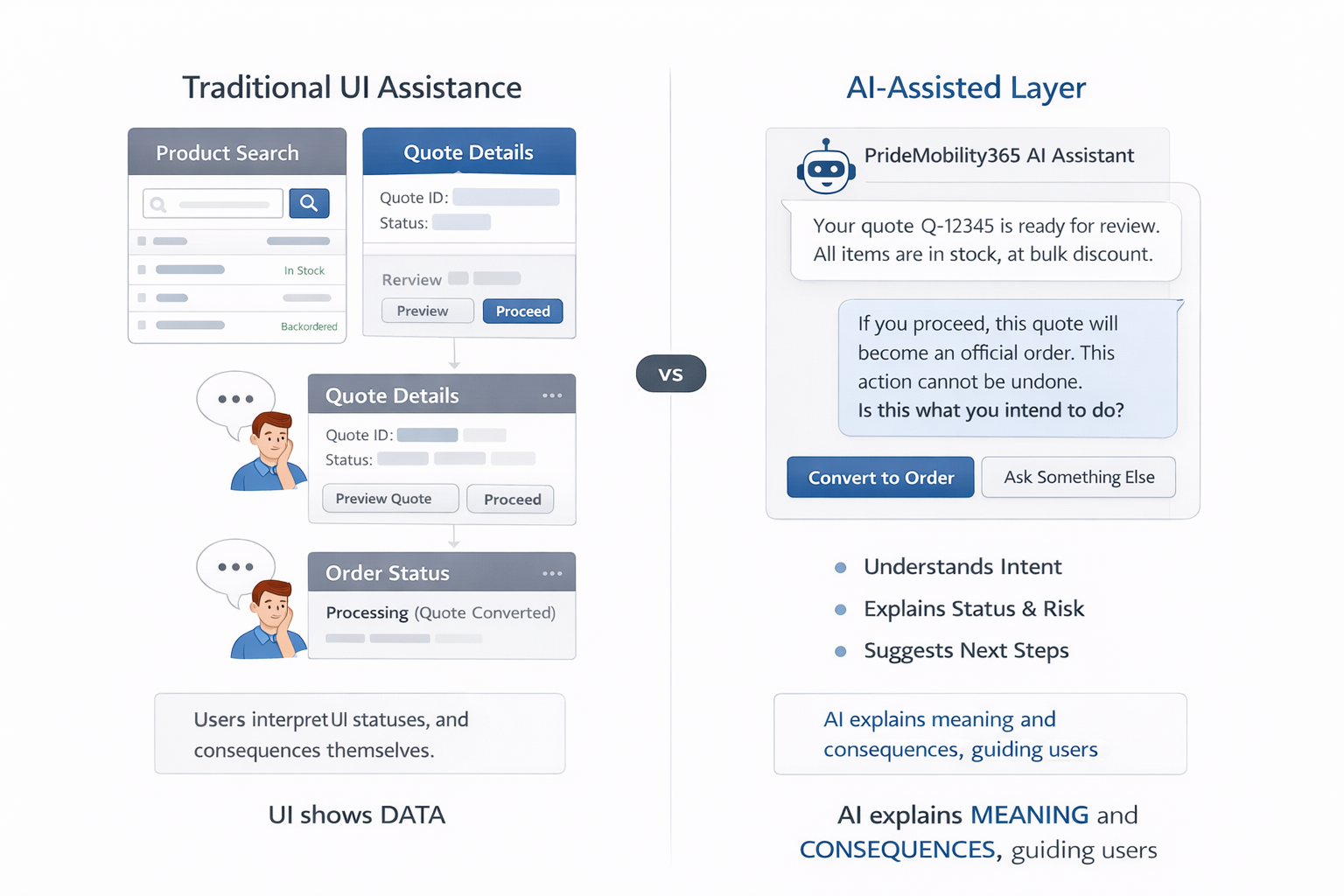 All enterprise data comes from secure system sources. AI explains — UI confirms.
