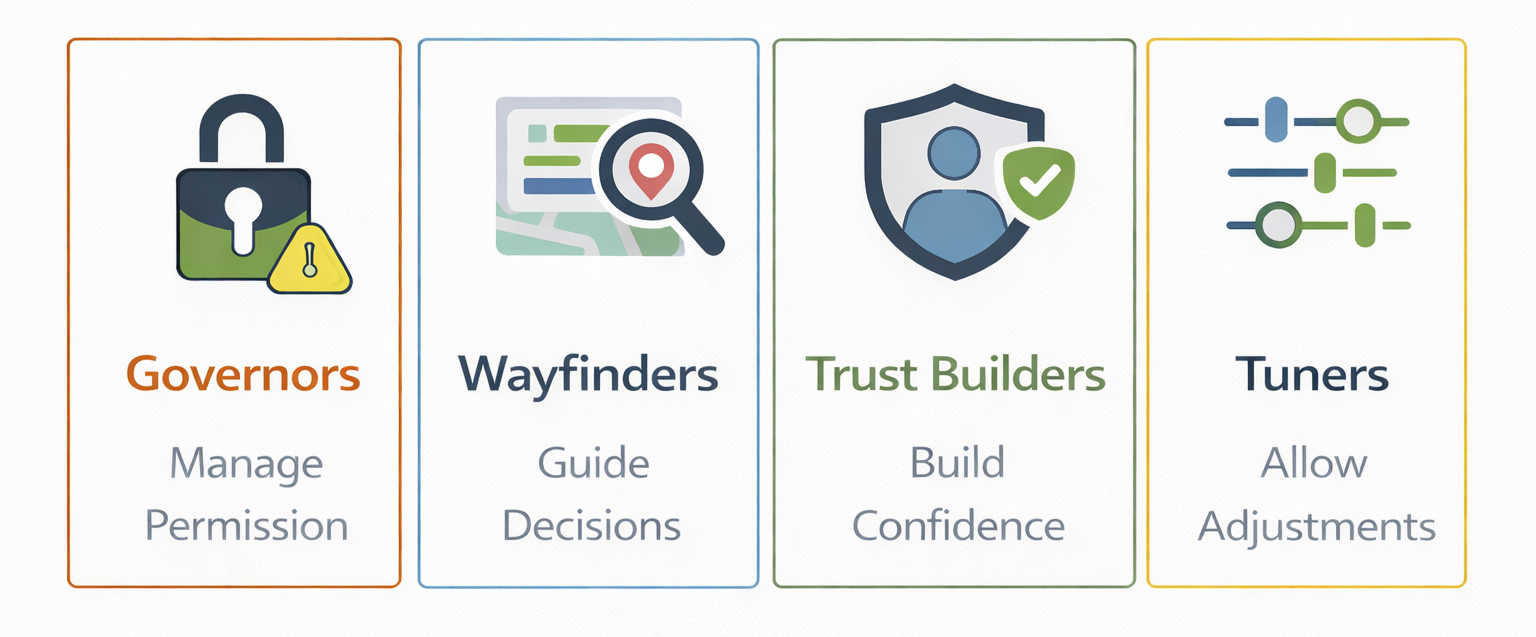 Governors(gaurdrails) - Prevent risky actions, Wayfinders - Guide forward,