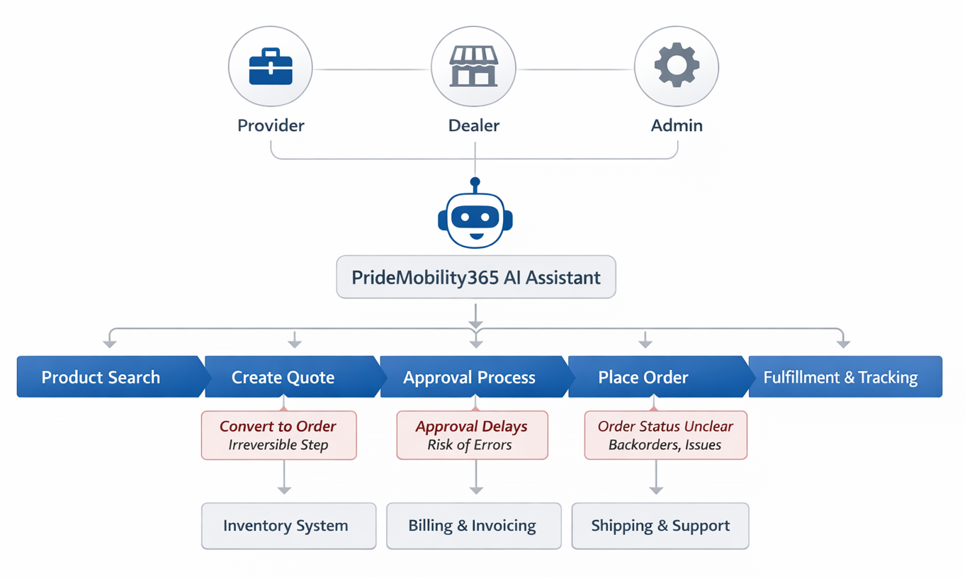 PrideMobility365 is an enterprise B2B platform used by providers, dealers, and administrators to manage parts search, quotes, approvals, orders, and fulfillment workflows.